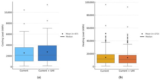The analysis of cooling and heating loads under the baseline and UHI-influenced scenarios provides key insights into the impact of localized warming. Figure 6a illustrates the cooling demand of all buildings across the neighborhood in these two conditions (current and current + UHI). For cooling loads, the mean (median) demand increases from 2551 kWh (2127 kWh) in the baseline scenario to 2733 kWh (2151 kWh) in the UHI-influenced scenario, representing a 7.1% (1.1%) increase. This underscores the additional cooling burden imposed by urban heat effects on buildings when integrated into the current TMY3 dataset.