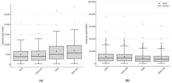 Cooling (a) and heating (b) load ranges across future weather and their UHI-induced scenarios.