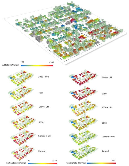 Energy Use Intensity (EUI) measures energy consumption per unit area (kWh/m2), allowing for direct comparisons across buildings of different sizes. Figure 8 illustrates heating and cooling EUI trends across the six weather scenarios, highlighting a sharp upward shift in cooling demand and an inverse trend for heating. Under current conditions, the mean cooling EUI across the neighborhood is 21.26 kWh/m2, but incorporating UHI effects leads to a 6.85% increase, raising it to 22.72 kWh/m2. Future climate projections indicate a dramatic rise, with cooling EUI reaching 40.61 kWh/m2 by 2050, representing a 91.0% increase from current condition. When UHI effects are factored in, 2050 cooling EUI increases further to 41.55 kWh/m2 (+2.3%). Deng et al. (2023) projected that cooling energy intensity in residential buildings could rise from 12 kWh/m2 to 32 kWh/m2 by 2050. By 2080, EUI reaches 54.03 kWh/m2, marking a 33.0% jump from 2050 and a 154.1% increase from current conditions. Additionally, 2080 + UHI cooling EUI increases further to 57.38 kWh/m2 (+6.2% from 2080). Likewise, Berardi and Jafarpur [94] projected that cooling EUI could increase between 15% and 126% by 2070 and Jylhä et al. [95] projected a 40–80% increase in cooling energy demand by 2100, depending on building typology and climate conditions. They highlight that factors such as insulation levels, window-to-wall ratios, and ventilation strategies significantly influence the extent of cooling demand increases.