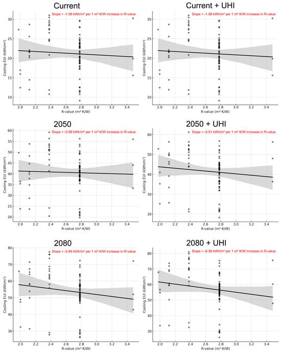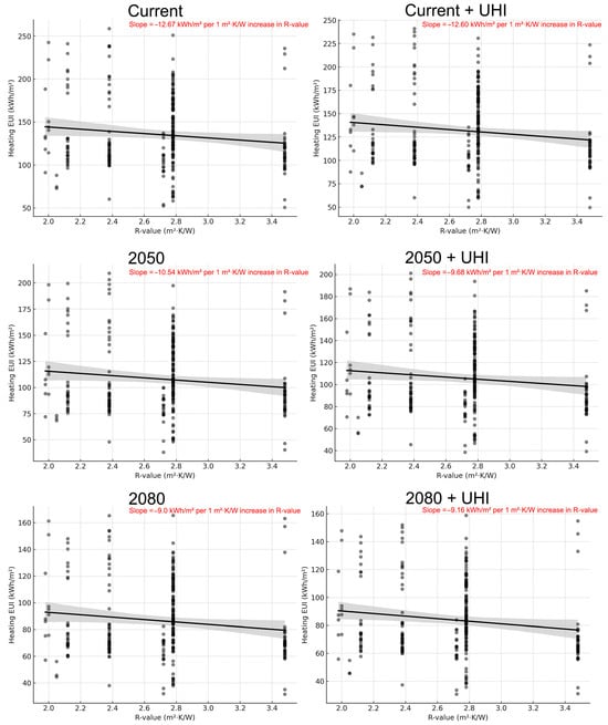 To enable cross-comparison between building templates, the impact of R-value, which represents the thermal resistance of wall assemblies, is explored, as it represents the most noticeable difference between building templates in the dataset (see Table 2). The analysis clusters buildings by their thermal resistance (R-value) to provide a unified perspective across scenarios and building types.