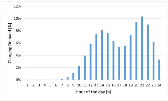 The assumed distribution is then the sum of two Gaussian distributions, which characterize the main peaks of usage during the day: one centered is at 1 Post Meridiem (PM), assuming that the charging events happens during lunches and another centered at 8 PM due to evening arrivals and e-bikes evening deposit. Each curve describing the behavior around the corresponding peak hour is characterized by a mean () and standard deviation (), selected to represent the typical user behavior, and the sum of the Gaussians has been normalized such that the total area equals 1, representing the probability distribution of charging service demand during the whole day, Figure 1. The values of are selected as 2.5 and 2 (h) for, respectively, the peak at 1 PM and at 8 PM. The rationale for such selection is that a 25% more variability in the users’ habits during the day, compared to the evening, has been assumed.