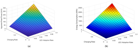 The first step of the comparative analysis includes an assessment of peak power and energy consumption at different penetration rates of LEVs. The proposed model combines probabilistic approaches with user-defined parameters to estimate peak power demand and daily energy consumption for different LEV adoption and charging station utilization rates. The modeling of daily usage of the charging stations is paramount to the analysis and, in absence of empirical studies on the behavior of tourists and inhabitants of the island of Favignana, the distribution has been hypothesized based on literature. In studies like [12,13,14], it is argued that the charging demands are concentrated at lunch time and in the evening both in touristic and urban scenarios.
