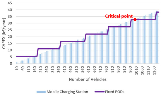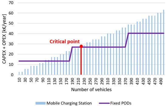 - From an economical point of view, results indicate that mobile charging stations offer a cheap and modular solution in low- and medium-demand environments, particularly in areas with seasonal trends of tourism fluctuations. Although their CAPEX per unit is significantly lower (€8000 per unit) compared to fixed PODs (€56,780 per unit), their OPEX is slightly greater due to periodic battery replacement, transportation, and maintenance costs (€2000–€3000 per year). Fixed PODs, by contrast, become economical only if over approximately 210 users charge per day, with lower operating costs per user but a massive initial investment.