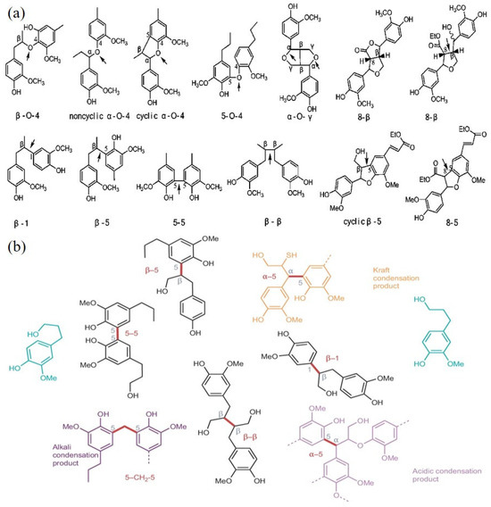 Major linkage types between the primary units of native lignin (a) [1] and post-processed technical lignin (b) [30].