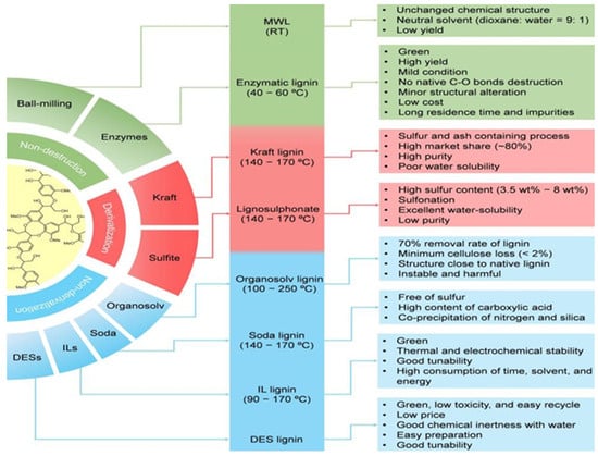 The key step in the conversion of lignin into a high-value fossil fuel substitute is to efficiently extract lignin from biomass. Many researchers have discussed the importance of the pretreatment of bioresources before further utilization [47,48,49]. Recently, people have used physical, chemical, biological, and physicochemical processes to separate the three major components of biomass [50,51,52,53,54,55,56]. The former two ways are widely used in biofuel production to improve the quality of substrates. Physical pretreatment uses heating, pressurization, steam, hot water, ultrasound, etc., while chemical pretreatment uses oxidation, ozonation, acid–base pretreatment, etc. [57]. These methods are often used in combination to achieve better results. Biological pretreatment is mainly used to break down the protective layer of lignin. In biological pretreatment methods, microorganisms play an important role and also produce useful by-products [57]. In the following sections, we will discuss different lignin isolation methods.