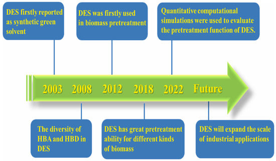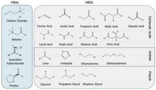 DES is a green solvent with low vapor pressure, high thermal stability, low toxicity, and biodegradability. These characteristics make it an ideal solvent for increasing the value of lignocellulosic biomass. DESs not only dissolve lignin lignocellulose biomass, but also further upgrade and utilize the extracted lignin [101]. Compared with ionic liquid, deep cosolvent has higher solubility and lower toxicity to lignin, not to mention its lower price and simpler storage [102,103]. Figure 5 shows the evolution of DESs as pretreatment solvents [104]. Compared to other solvents, deep eutectic solvents are widely used because of their superior ability to dissolve lignin from biomass [105]. Many studies have shown that lignin can be easily extracted or removed by using DESs. They contain two or three different compounds that act as hydrogen bond donors (HBDs) and hydrogen bond acceptors (HBAs), as shown in Figure 6 [105]. Hydrogen bonding is the major interaction between HBAs and HBDs; electrostatic and van der Waals forces may also play a role [106]. HBAs can be inorganic salts, such as the common choline chloride (ChCl) with high molecular weight, while HBDs are usually low-molecular-weight compounds, such as amine or carboxylic acid (Figure 6). For example, many biomass-derived carboxylic acids, such as formic acid (FA), lactic acid (LA), and oxalic acid (OA), can be used as hydrogen bond donors (HBDs) in DES synthesis [101]. The effects of DESs, composed of choline chloride and renewable carboxylic acids or renewable polyols, on corncob pretreatment have been systematically reported. Zhang et al. [107] chose three DESs (monocarboxylic acid/ChCl, dicarboxylic acid/ChCl, polyol/ChCl) to study the degree of the delignification and enzymatic hydrolysis of corncob.