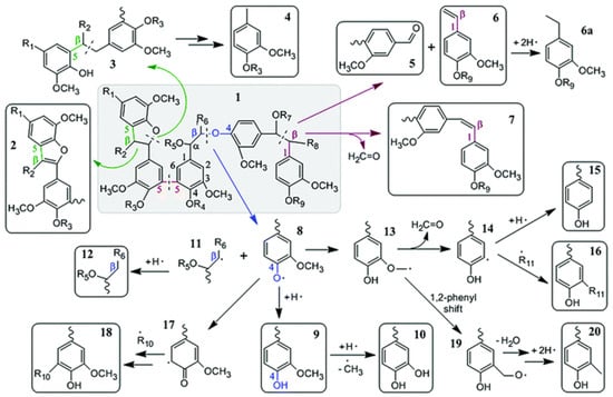 Main lignin pyrolysis reaction routes (Lignin structure dependent pyrolysis reactions as predicted by literature and present NMR results, with emphasis on LignoBoost lignin pyrolysis. 1 hypothetical lignin source representing the most common bonds in LignoBoost and APBL; 2 relatively stable β-5 product in the primary decomposition step; 3 α-O cleavage product; 4 methyl guaiacols; 5 aldehydes; 6 styrenes and 6a (“reduced vinyl-”) ethyl-phenols; 7 stilbenes; 8 phenoxy radicals; 9 guaiacols; 10 catechols; 11, 13, 14, 17, 19 transient radicals; 12 aliphatics; 15 phenols; 16, 18 condensation products (e.g., 4-O-5 dimers); 20 cresols.) [146].