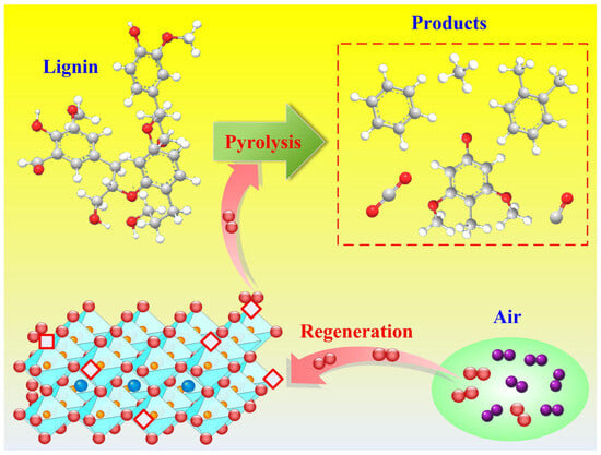 Calcite has a cubic crystalline structure with the general formula ABO3, in which the A-site is generally an alkali metal, alkaline earth metal, or a rare earth metal ion with a large radius, and the B-site is a transition metal ion with a small radius. Because of the good thermal stability of the calixarene-type metal oxide catalysts, they can promote the breaking of certain types of chemical bonds in lignin. Meanwhile, they are non-toxic, harmless, and easy to recycle, thus showing good application prospects. The process of lignin pyrolysis, catalyzed by chalcogenide, is shown in Figure 8. On the one hand, adsorbed oxygen on the surface of chalcogenide can be released to participate in the reaction. The oxygen consumed during the reaction can be replenished by the oxygen in the air during the regeneration process; on the other hand, chalcocite can provide an active center for promotion the pyrolysis of lignin to generate aryl oxygenated compounds [163].