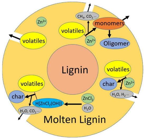 Metal salt catalysts have attracted much attention due to their high efficiency and low price. Many studies have shown that adding metal salt catalysts to the pyrolysis process can help enhance the target products’ selectivity [164]. Geng et al. [165] investigated the effect of Ni(HCOO)2 on the in situ catalyzed pyrolysis of alkali lignin. It was found that Ni(HCOO)2 increased the selectivity of alkylphenol products (13.25%) by acting in the following two ways: first, the hydrogen produced by the pyrolysis of formic salt is favorable for the removal of methoxy, which can promote the addition reaction of unsaturated groups, such as the aldehyde group, carbonyl group, and carboxyl group, and reduce the unsaturation degree of the pyrolysis product, which is conducive to the generation of phenol; secondly, the presence of Ni can help the conversion of phenol into alkylphenol. Peng et al. [166] investigated the performance of in situ catalyzed lignin pyrolysis of corn stover with K2CO3 and Na2CO3. The results showed that adding carbonates decreased bio-oil yield, while increasing the selectivity of methoxyphenols in bio-oil and promoting the generation of gas products. For instance, there was a significant increase in the selectivity of CO2 in gas products. Hu et al. [167] investigated the in situ catalyzed lignin pyrolysis of a cellulase corn stover using ZnCl2. The possible mechanism of action of ZnCl2 in lignin pyrolysis is shown in Figure 9. The acidic H [ZnCl2(OH)] generated by the reaction of H2O with ZnCl2 significantly promotes the pyrolysis of lignin to produce coke, CO2, and H2O, in which the yields of CO2 and H2O are 2 to 3 times higher than those in the noncatalytic case.