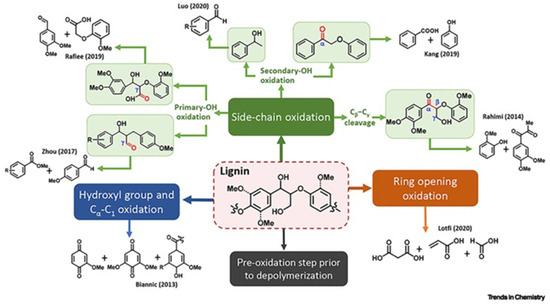 - Zhang, Z.; Yin, G.; Andrioletti, B.J.T.M.C. Advances in value-added aromatics by oxidation of lignin with transition metal complexes. Transit. Met. Chem. 2022, 47, 189–211. [Google Scholar] [CrossRef]