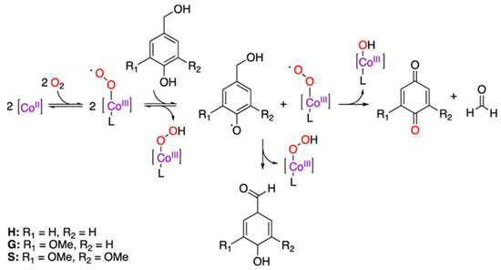- Biannic, B.; Bozell, J.J. Efficient cobalt-catalyzed oxidative conversion of lignin models to benzoquinones. Org. Lett. 2013, 15, 2730–2733. [Google Scholar] [CrossRef] [PubMed]