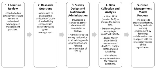 A multi-phase research approach was adopted, consisting of an extensive literature review, followed by a survey conducted nationwide. This survey targeted all existing crude oil exploration, production, and processing (refining) companies throughout the country (Table 1). The survey was conducted to include all existing crude oil production and refining (processing) enterprises in Türkiye as of 2021. While the relatively small number of companies operating in the petroleum industry in Türkiye may be considered a limitation, the study was able to reach the entire population of interest. Prior to the implementation of the survey, ethical approval was granted by the Ethics Committee of Ankara University, under decision number 237, dated 21 June 2021. It was assured that all information obtained from the research would be utilized exclusively for scientific purposes and that all personal data, including survey results, would be kept confidential. The data were collected through online questionnaires. The research questions were analyzed and verified based on an analysis of these data. The time span of data collection was from August to October 2021. In this study, 92 questionnaires were analyzed and evaluated. Additionally, the analysis of the questionnaire data was conducted using the SPSS (Statistical Package for Social Sciences) version 24.0 software to derive the results. The reason for using SPSS version 24.0 is that it offers a user-friendly interface and a wide range of statistical tools, making it ideal for data analysis in social sciences. Additionally, it provides features such as advanced data visualization, integration with other software, and enhanced statistical functions, ensuring reliable and efficient research outcomes. To determine the construct validity of the scales used in the research, exploratory factor analysis was conducted. To assess whether the scales were suitable for factor analysis, the Kaiser–Meyer–Olkin (KMO) measure and Bartlett’s test were performed. A correlation analysis was conducted to explain and test the research questions [39]. Based on the literature review, research, analyses and survey results, a proposed green management model has been designed for Türkiye’s petroleum industry. The technical roadmap of the study was developed as follows (Figure 2).