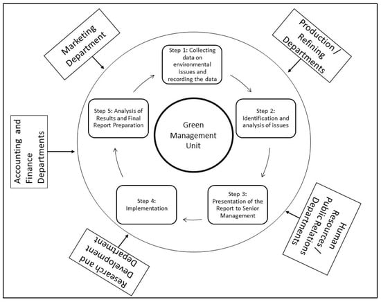 Given the substantial quantities of raw materials (i.e., oil and natural gas), heavy machinery, and diverse chemicals utilized throughout the exploration, production, and refining processes, the sector is inherently linked to emissions of gasses and particulates, as well as the generation of waste. In this context, the green management approach and its associated practices serve as a guiding framework for environmental preservation, energy management, and the effective management of clean water and waste. The proposed green management model for Türkiye’s petroleum industry has been designed with the following foundational elements [39].