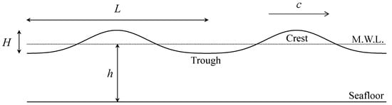 Coastal waves are specified by the following parameters: mean water depth , wave length , wave height and phase velocity as shown in Figure 2. Wave period is determined by the wave source and is constant while propagating until the wave breaks. The coastal waves are classified as the deep-water waves and the shallow-water waves, for and , respectively. Hereafter, the subscript 0 is added to the wave parameters for deep-water waves such as and .