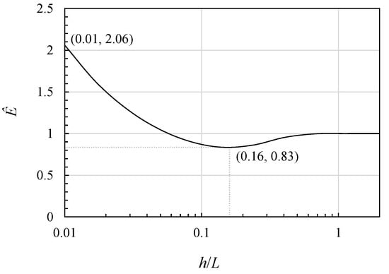 The group velocity is given by Equation (3), and the energy density in coastal waves can be calculated from Equation (6). The normalized energy density profile as a function of relative mean water depth is shown in Figure 4, where is the normalized energy density. The energy density in deep-water waves is given by from Equation (4), where is wave height in deep-water waves. The energy density shows a concave profile because of the convex group velocity profile; thus, there are coastal waves with less energy density.