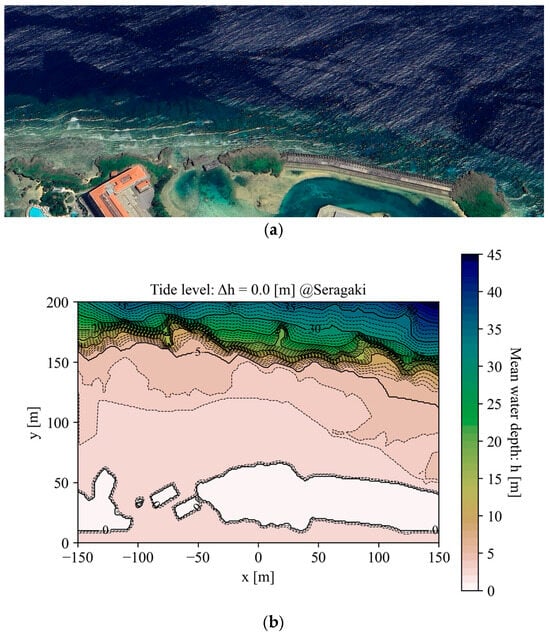 An example of applying the semi-analytical method using bathymetry data obtained from multibeam sonar surveying at Seragaki, Okinawa, Japan, is shown. As illustrated in Figure 5, the Seragaki littoral zone includes several specific areas: from the offshore side, it begins with a deep zone, followed by a sharp shallowing at the drop-off topography, then transitions into the surf zone, and finally reaches the breakwater. The bathymetry data represent water depths at the mean water level, assuming no tidal variation. The coastline and breakwater at Seragaki face northward towards the sea. In the semi-analytical method, while the wave propagation direction does not explicitly appear, it is interpreted as propagating in a direction consistent with the phase velocity field. Note that the and directions represented in this section are not related to the wave propagation direction. As swell wave conditions, regular waves with the wavelength of m and the wave height of m, are assumed. In this case, the wave period is s, the phase velocity in deep-water waves is m/s, the energy density in deep-water waves is kJ/m2, and the energy flux is kW/m.