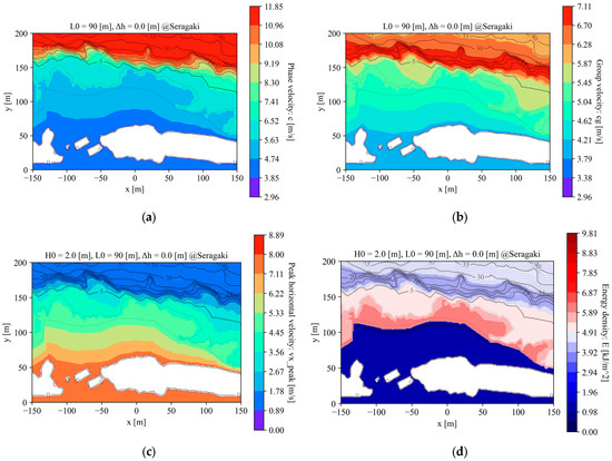 Coastal wave characteristics: (a) phase velocity field; (b) group velocity field; (c) peak horizontal velocity field; (d) energy density field. In deep-water waves, the phase velocity, the group velocity, and the energy density are m/s, m/s, and kJ/m2, respectively. The peak velocity exceeds the phase velocity at approximately 6 m/s, and the incipient breaking positions are marked by sudden jumps in energy density, as indicated by the color gaps.