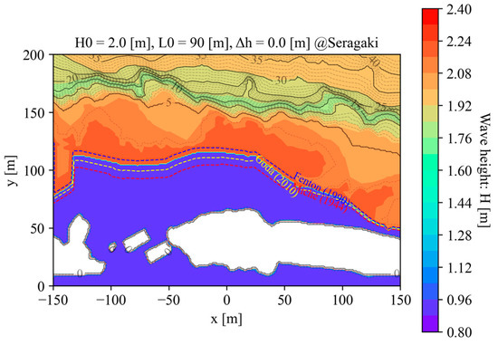 Figure 7 illustrates the wave height field, where the incipient wave-breaking positions are visible as a sudden jump in wave height, represented by a color gap in the field. The incipient breaking positions are marked by the analytical breaking index, and the results from the empirical formulas given by Equations (8a)–(8c) are indicated by the red, yellow, and blue dashed lines, respectively. To demonstrate the validity of the proposed method, the different tidal levels (Δh) and deep-water wave heights (H0) are presented in Figure A1 and Figure A2 in Appendix A, respectively.