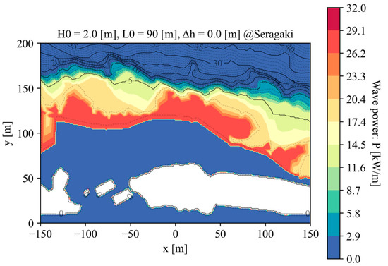 The distribution of potential wave power for the turbine is shown in Figure 8. Since wave power is proportional to the cube of the underwater flow velocity, it changes rapidly in the surf zone due to the wave shoaling, reaching its maximum value right before the wave breaks. The maximum wave power is found in the surf zone seaward of the incipient wave-breaking positions, where the mean water depth is 3–4 m without tidal variation. The wave energy flux is kW/m, and in the region right before wave breaking, the wave power approaches a value comparable to the energy flux. Despite the small water depth in the surf zone, it contains significant wave power, making it suitable for direct energy harnessing using compact WECs. It is important to properly select the installation site, choosing areas with high wave power while avoiding both wave-breaking areas, which have destructive impacts on a WEC, and post-breaking areas, which have diminished power. The different tidal levels (Δh) and deep-water wave heights (H0) are presented in Figure A3 and Figure A4 in Appendix B, respectively.