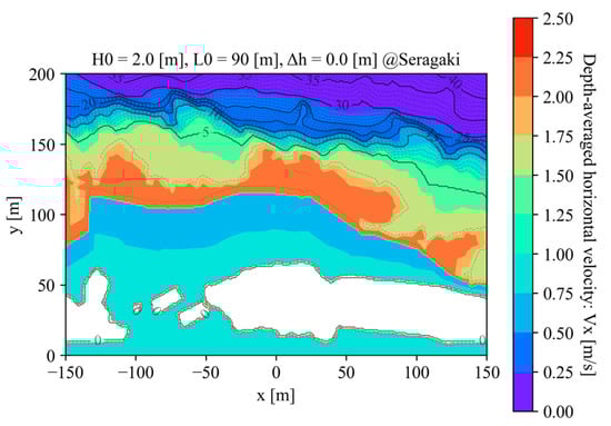 In the above formulation, it is assumed that the dispersion relation, and , has been calculated with sufficient accuracy. We utilize the magnitude of the horizontal velocity component since it characterizes the oscillatory flow. The wave-period-averaged horizontal velocity is calculated as , which is solved analytically. The depth-and-wave-period-averaged horizontal velocity is then determined numerically using the Gauss–Kronrod quadrature method: .