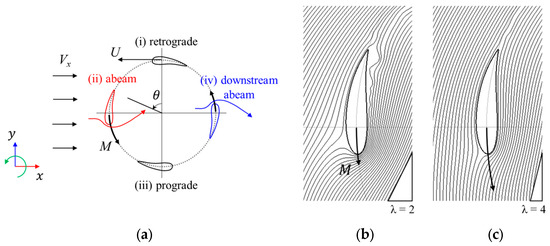 As shown in Figure 10a, the positive torque of the H-Darrieus turbine is generated while the flow enforces upward along the blade surface in the abeam duration, producing a downward reaction force. However, if flow separates on the blade surface, the flow cannot be efficiently enforced upward, leading to a reduction in the positive torque (Figure 10b). Therefore, it is important to select an optimal combination of airfoil and TSR to prevent flow separation (Figure 10c).