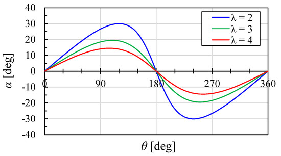 The variation in AoA in the blade completes one revolution, as shown in Figure 11. For conventional airfoils, flow separation tends to occur at AoA around 15 degrees; therefore, a TSR of approximately 4 is considered optimal. However, in cases where multiple blades are installed, as in typical H-Darrieus turbines, the incoming flow decelerates due to blockage effects, lowering the optimal TSR to approximately 3 [19]. For thicker airfoils, which are more resistant to flow separation, the suitable TSR decreases, while for airfoils prone to separation, a higher TSR is required.