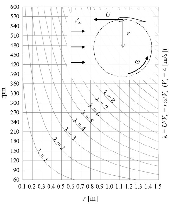 Based on the discussions above, with a turbine diameter of 2 m and a TSR of 3, the turbine’s rotational speed would range from 120 to 180 rpm to maximize power. The relationship between turbine radius, rotational speed, and TSR is organized in Figure 12, assuming a maximum horizontal flow velocity of 4 m/s.
