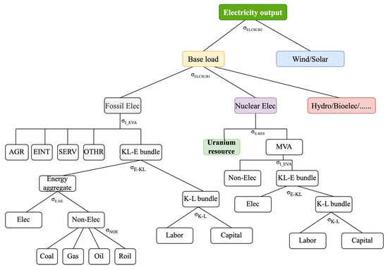 In the C-GEM model, modeling the impact of uranium resource constraints on nuclear power capacity is accomplished by integrating the Hotelling rule [41,42]. According to this rule, natural resources like uranium are considered scarce, with extraction costs rising gradually as resources are depleted. Within the C-GEM model, this principle is used to characterize the economic value and extraction costs of fuel resources, reflecting the influence of resource depletion on energy production. Uranium resources in nuclear power production are positioned as the highest-level input in the CES production function. A Leontief production function is employed, with an elasticity of substitution set at 0 between uranium and other inputs such as capital, labor, and other intermediate inputs. Utilizing Leontief production functions ensures that the distinctiveness of uranium resources is accurately portrayed in the model. Under this model configuration, any shortage of uranium directly constrains the output capacity of nuclear power, as these resources cannot be compensated for by increasing other inputs like capital or labor. To model uranium resource inputs for nuclear power, this study integrates domestic resource development expenditure data [21], with uranium import data from The Observatory of Economic Complexity (OEC) [43]. Based on data from 2015–2019, the model determines an annual average uranium resource input of USD 164 million (Supplementary Table S2), thereby providing the economic input parameters for the CES production function for the benchmark year.