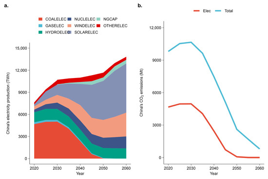 As a low-carbon energy source, nuclear power demonstrates a consistent upward trend throughout the simulation period, with its production increasing from 366 TWh in 2020 to 1626 TWh by 2060. This expansion not only mitigates China’s dependence on fossil fuels but also improves energy security and sustainability. Concerning carbon emissions, both those from the power sector and the overall emissions exhibit a downward trend (Figure 2b). Specifically, emissions from the power sector decrease from 4.7 Gt CO2 in 2020 to near-zero by 2050, and total carbon emissions linked to fossil fuel consumption decrease from 9.8 Gt CO2 in 2020 to a mere 0.8 Gt CO2 by 2060, with the remaining emissions offset by carbon sinks. Hence, by increasing the share of nuclear power and other clean energy sources, the power generation mix can be improved, carbon emissions reduced, and progress toward carbon neutrality supported.
