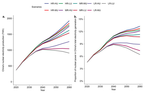 Nuclear power generation and its share in total electricity generation in different scenarios from 2020 to 2060. (a) Variation of nuclear power generation in China under different scenarios. (b) Changes in the proportion of nuclear power in China’s total electricity generation.