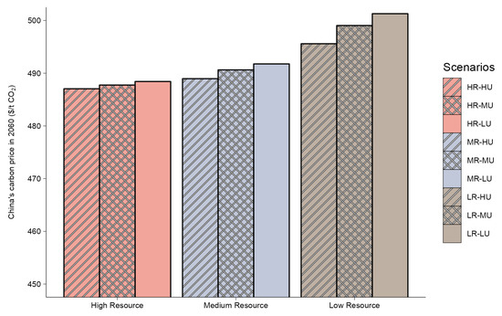 Forecasted carbon prices under different uranium resource and utilization scenarios in 2060.