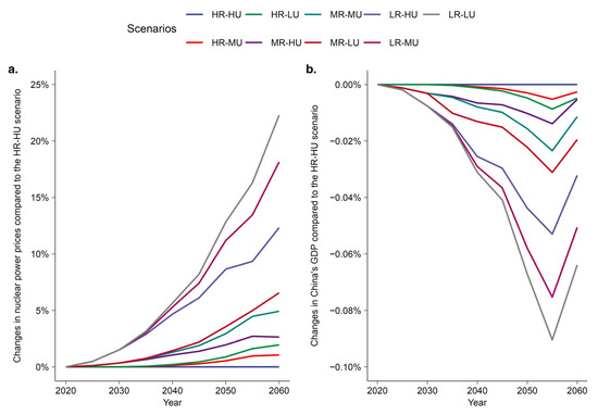 Relative trends in nuclear power prices and gross domestic product (GDP) across different scenarios (2020–2060). (a) Percentage change in nuclear power prices relative to HR-HU (high-resource and high-utilization rate) scenario from 2020 to 2060. (b) Percentage change in China’s GDP relative to HR-HU scenario across different scenarios.