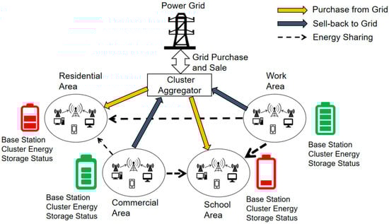Research on dispatching strategies for base station backup energy storage in grid demand response has also been conducted. Reference [11] establishes an economic dispatch model for the 5G base station light-storage system, considering hourly electricity prices and base station load. Reference [12] proposes an energy storage regulation algorithm based on the upper confidence interval of battery state perception to maximize the weighted difference between regulation benefits and load curve variance. Yet, reference [13] explores transferring excess energy storage from 5G base stations to the grid. However, these studies mostly focus on the base station clusters’ interaction with the grid, neglecting energy flow and regional cooperativity among the clusters. In contrast, reference [14] connects base stations and the power distribution network, while reference [15] proposes an optimal power purchase algorithm based on one-sided matching and introducing a bidirectional preference list for energy storage regulation in 5G distribution network base stations. However, the majority of current studies explore single or few-to-many energy-sharing models, with limited analysis of many-to-many configurations.