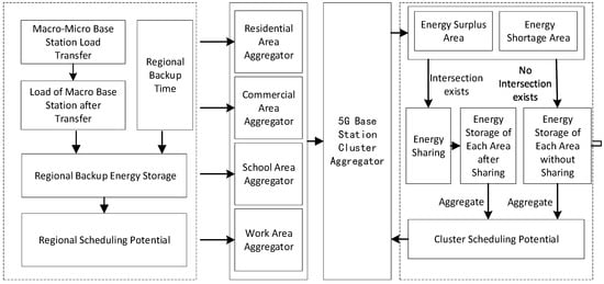 The load curves of 5G base stations in different functional areas show distinct differences and complementarity [20]. Regional aggregation through real-time energy sharing can further enhance overall scheduling potential. High-load functional areas can prioritize energy use from adjacent surplus areas, reducing reliance on power grid purchases and mitigating peak grid loads. This strategy significantly improves the scheduling potential of 5G base station clusters. The construction process of the 5G base station energy storage scheduling potential model is shown in Figure 2.