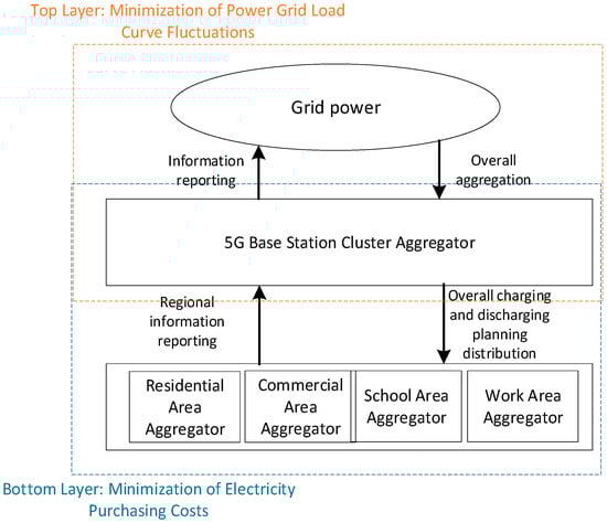 In the top layer, the 5G macro-micro base station integrates the cluster load status information and energy storage status information and uploads it to the superior power grid, participates in the power grid dispatching in the form of cluster aggregator, minimizes the variance of the load curve of the power grid, and obtains the overall charge and discharge plan based on the lower optimization, further dispatching between regions. At this point, with the economy of a single region as the goal, the specific scheduling strategies of each region at different times are solved, respectively, so that each region can complete the charge and discharge action together.
