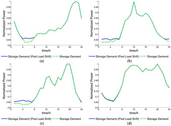Comparison of the original backup energy storage demand curve after load transfer. (a) Residential area, (b) commercial area, (c) school area, (d) work area.