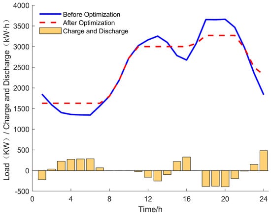 As can be seen from Figure 6, the peak time of the power grid is mainly 12:00–14:00 and 18:00–21:00, and the valley time is mainly 0:00–7:00 and 22:00–24:00. The energy storage of the 5G base station conducts overall discharge at the peak and charge at the valley, which has the effect of peak shifting and valley filling on the power grid curve, leveling the overall load curve, and will not cause new curve fluctuations due to the additional charging and discharge of energy storage.