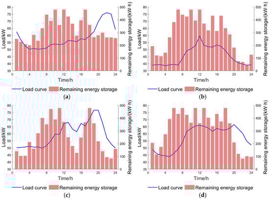 Results of charge and discharge plan allocation for each functional area. (a) Residential area, (b) commercial area, (c) school area, (d) work area.