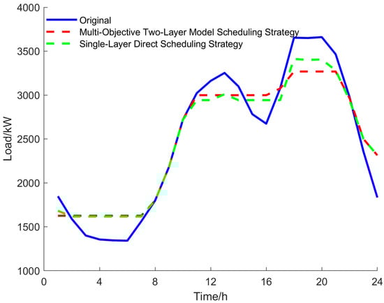 The scheduling results from the multi-objective two-layer optimization model of the 5G base station cluster in this paper are compared with the original power grid load curve, without single-target collaborative scheduling or optimization measures. The results are presented in Figure 8 and Table 1.
