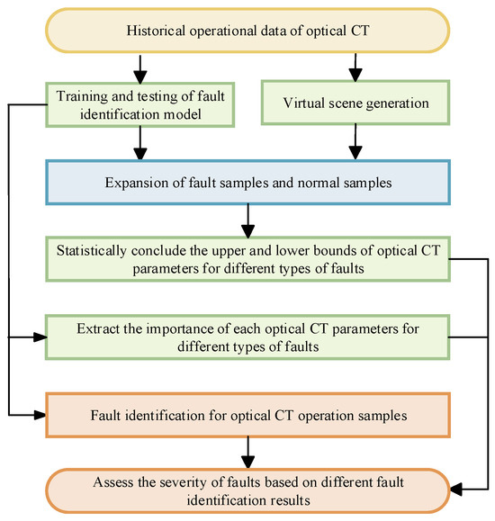 The overall technical flowchart is shown in Figure 1. Firstly, train and validate the fault identification model using historical samples of optical CT from a converter station in Hebei province in China. On the premise of ensuring the accuracy of the identification model, a large number of virtual scenes are constructed based on sample generation algorithms, and the identification model is used to assign fault types to the virtual scenes, expanding the fault samples. Subsequently, upper and lower bounds of optical CT parameters were concluded for different types of faults, providing data support for assessing the severity of faults. Finally, fault identification was carried out for the operation samples of optical CT, and the severity of different fault types was evaluated.