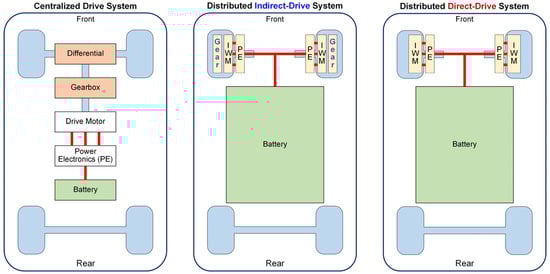 As a distributed drive system, the distinctive feature of IWM systems lies in their distribution across multiple wheels, powerful propulsion, and enhanced transmission efficiency compared to centralized drive systems. Figure 1 illustrates a centralized drive system, distributed indirect-drive system, and distributed direct-drive system for EVs. It can be observed that the centralized drive system, in addition to the essential components such as the battery, power electronics (PE), and motor, requires a gearbox and differential, leading to a decrease in transmission efficiency.