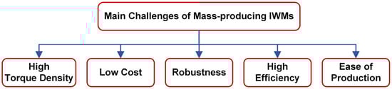 The main challenges in mass-produced direct-drive IWMs for EVs are summarized in Figure 2, with detailed descriptions to follow in subsections.