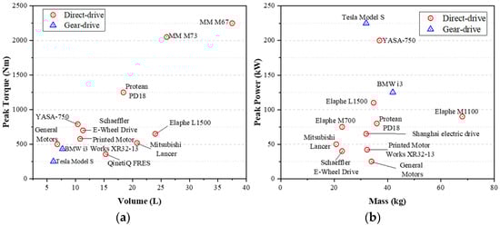 The statistics of current industrial IWM products. (a) Peak torque and motor volume of typical drive systems. (b) Peak power and motor mass of typical drive systems.