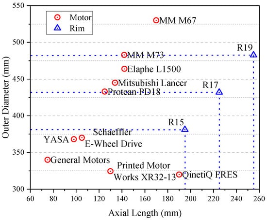 Both machine continuous and peak torque are largely proportional to the product of the machine axial length and square of the machine diameter, commonly denoted as D2l. The recent Protean/Brabus E-Class prototype vehicles, the Mercedes W212 E-class platform, can be purchased with a range of wheels from 16 in to 19 in as standard factory options []. The diameter of PD18 is 420 mm which is suitable for wheels of 18 in. Figure 4 showcases the outer diameter and axial length of commercial IWM products for reference.