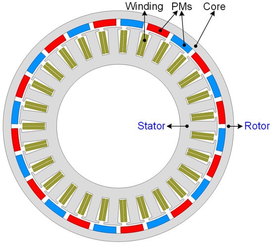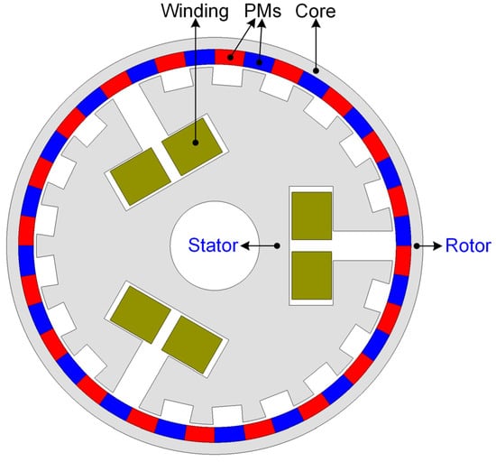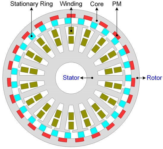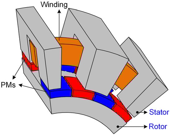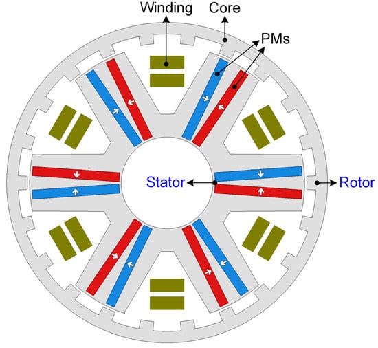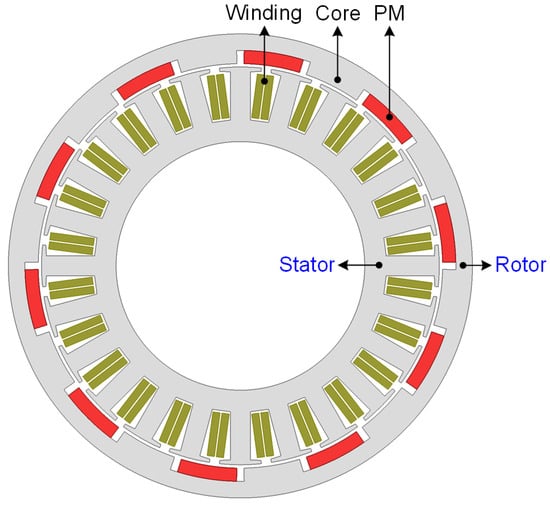 Within the realm of conventional PMSMs, there exists the surface-mounted PMSM (SPMSM) [], interior PMSM (IPMSM) [], consequent-pole PMSM (CPPMSM) [], and PM-assisted SynRM (PMaSynRM) []. Furthermore, flux-modulated machines, an evolving category of electric machines, have garnered significant research attention in recent years. This class encompasses magnetic gear machines (MGMs) [], PM vernier machines (PMVMs) [], transverse flux PM machines (TFPMMs) [], flux-switching PM machines (FSPMMs) [], flux-reversal PM machines (FRPMMs) [], and hybrid excited machines (HEMs) [].