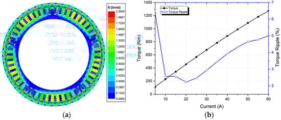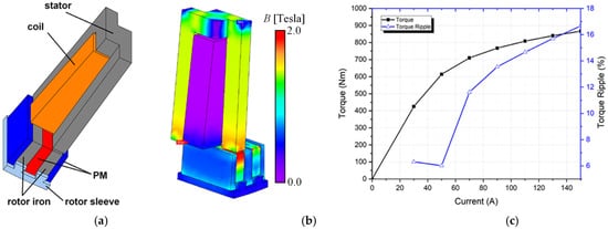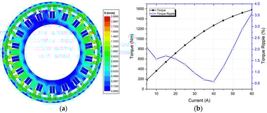 In EVs, the direct-drive IWM system lacks a gear reducer, necessitating higher output torque [,]. However, the torque density of IWMs is often insufficient to meet the requirements of various vehicle types []. Typically, the gear ratio of EV transmission systems is usually around 6 to amplify the output torque and obtain a minimum total mass [], which gives a stringent output torque requirement for direct-drive systems.