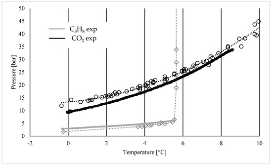 The diagram shown in Figure 4 describes the phase boundary equilibrium for pure carbon dioxide and pure propane hydrates. It was realized with experimental data collected from the literature [37,38,45,46,47,48] and aims to define the thermodynamic region that the results of the present research are expected to fall within.