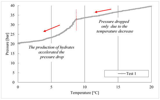 In Test 1, the production of hydrates started at approximately 8.6 °C. In the following experiments, carried out with the same gas–water mixture, the process manifested itself at higher temperatures: 11.3 °C in Test 2, 11.8 °C in Test 3, and so on. It means that the process started at progressively more severe thermodynamic conditions, proving the manifestation of a certain “memory effect” within the system.