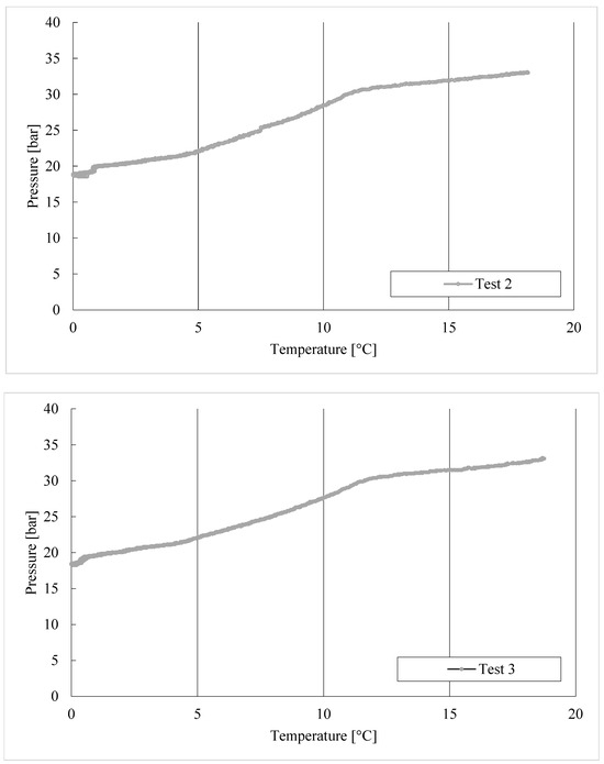During the formation process, the internal pressure decreased with temperature but, in each test, two different steps can be distinguished: the first, during which pressure decreased exclusively as a consequence of its proportionality with temperature; then the drop in pressure accelerated due to the capture of gas molecules into water cages. This trend is highlighted in the diagram referring to Test 1, visible in Figure 6.