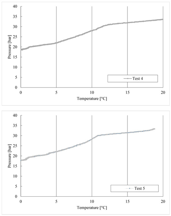For instance, Figure 8 compares the pressure evolution over time of Test 5, where the process began at relatively high temperatures, and Test 6, where it needed lower temperatures to manifest itself.